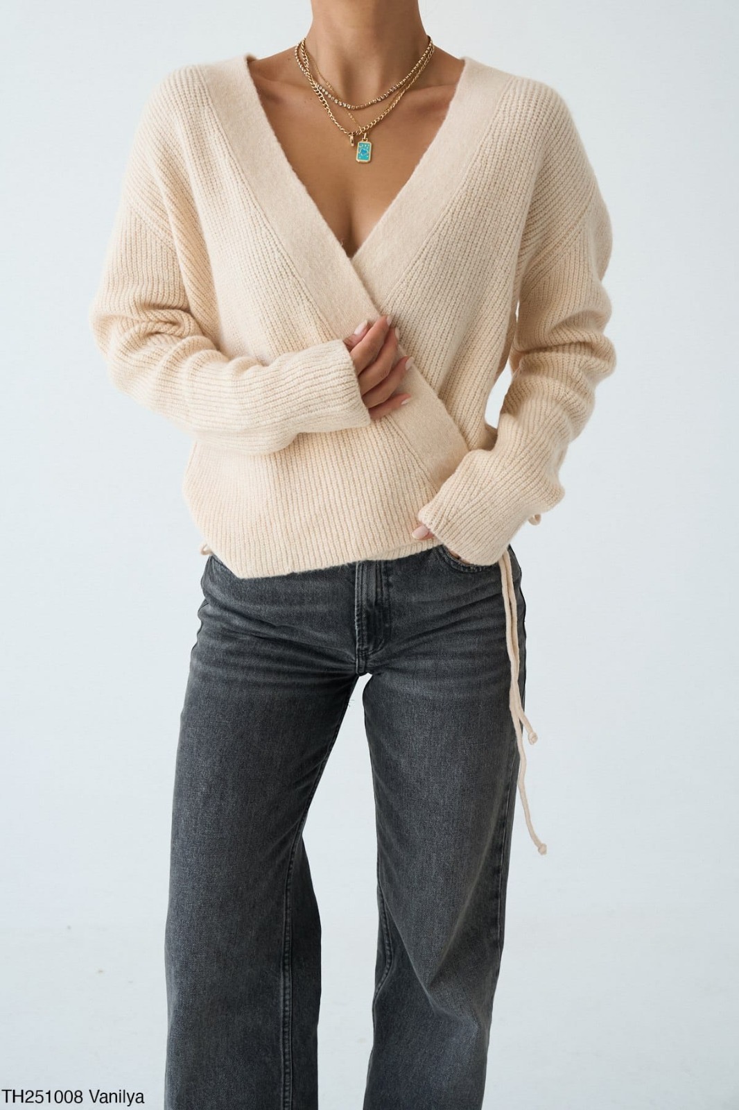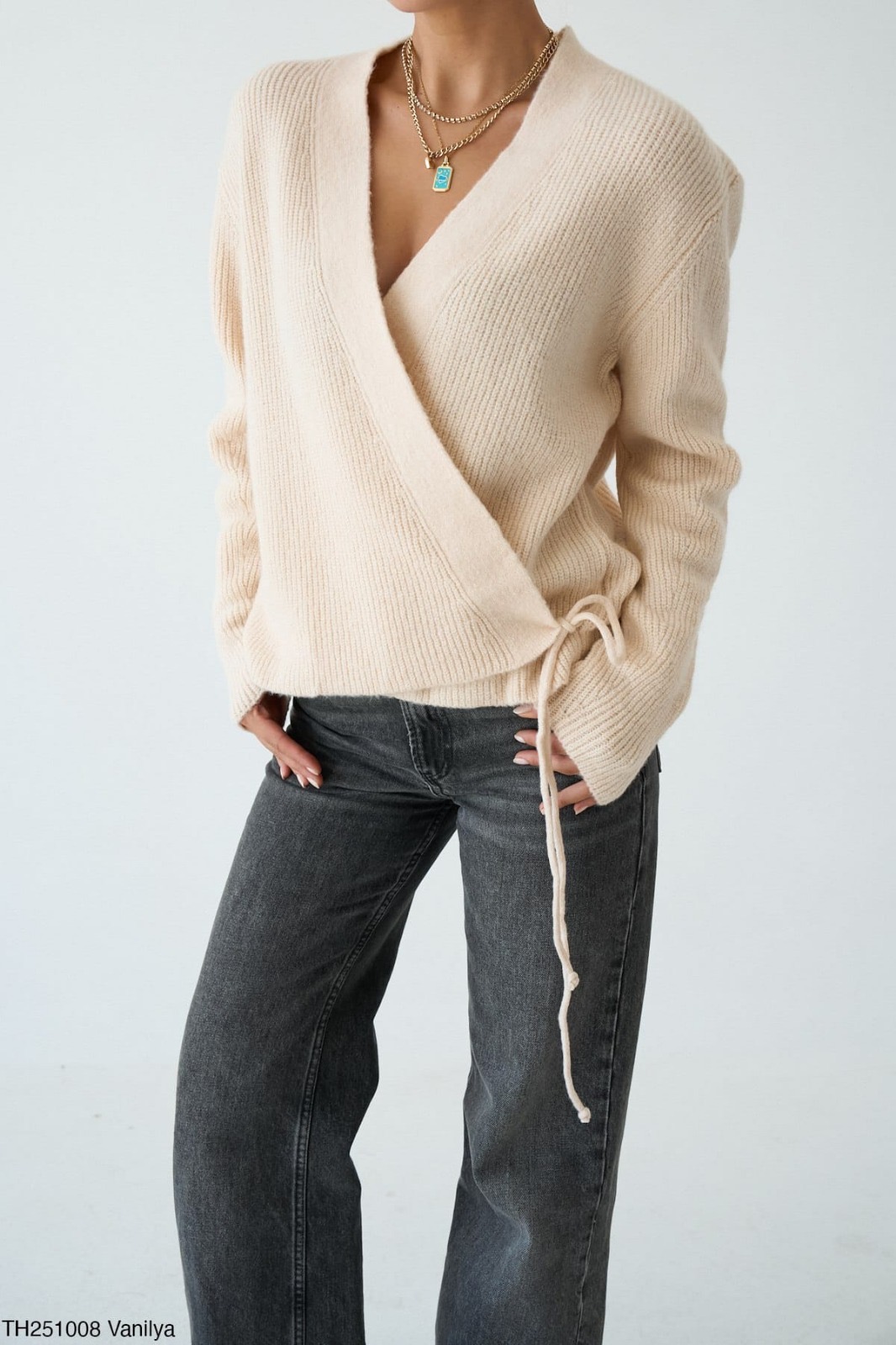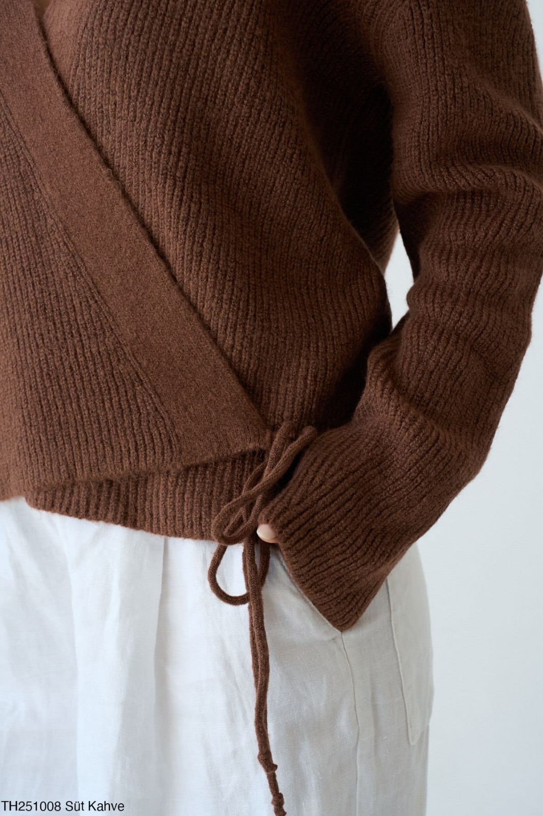 Yumuşak dokulu, bağlamalı triko kazak.
