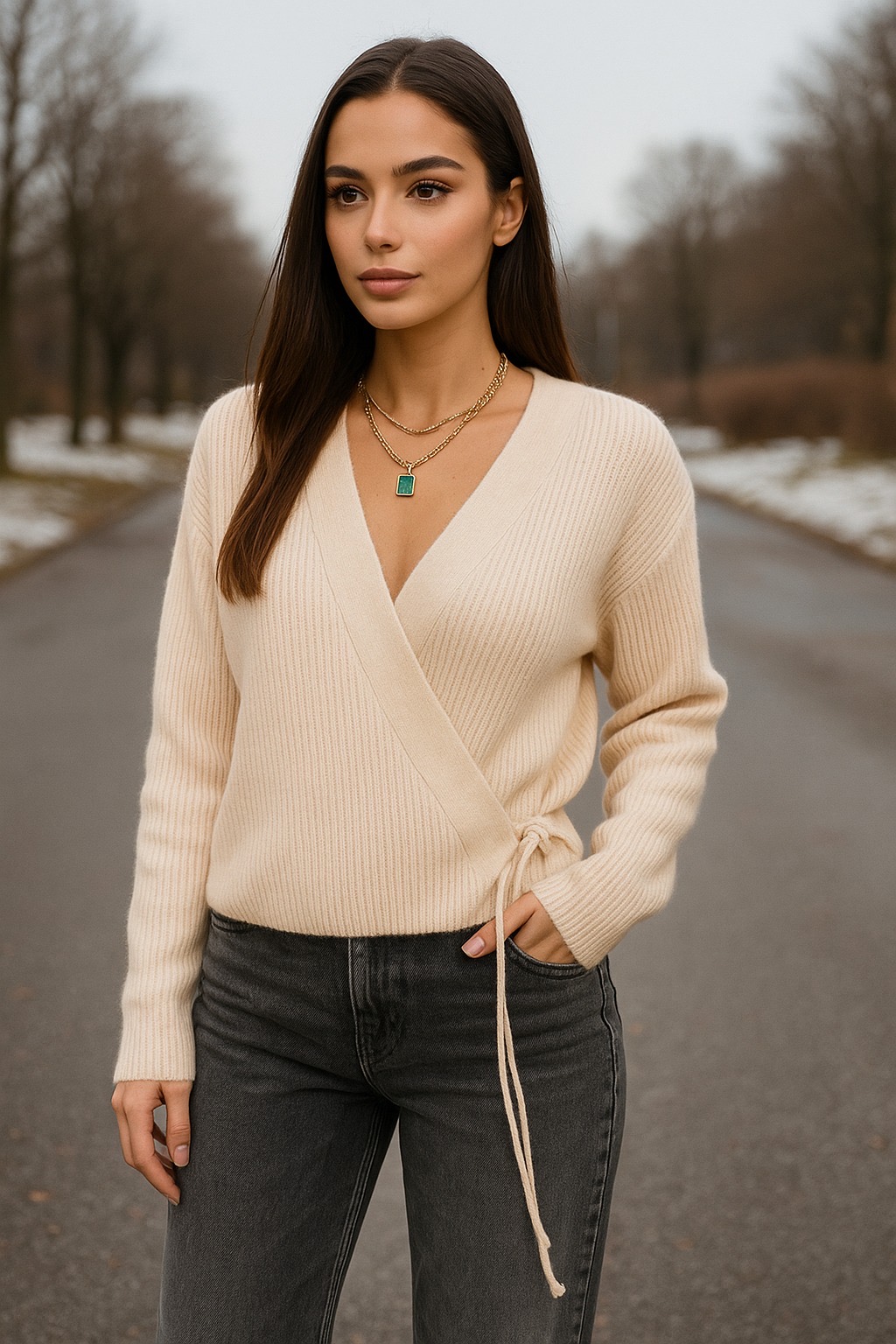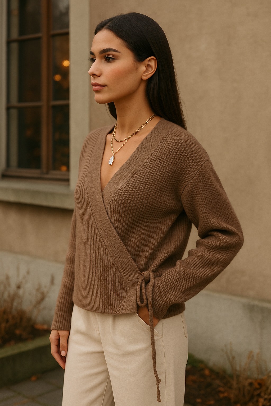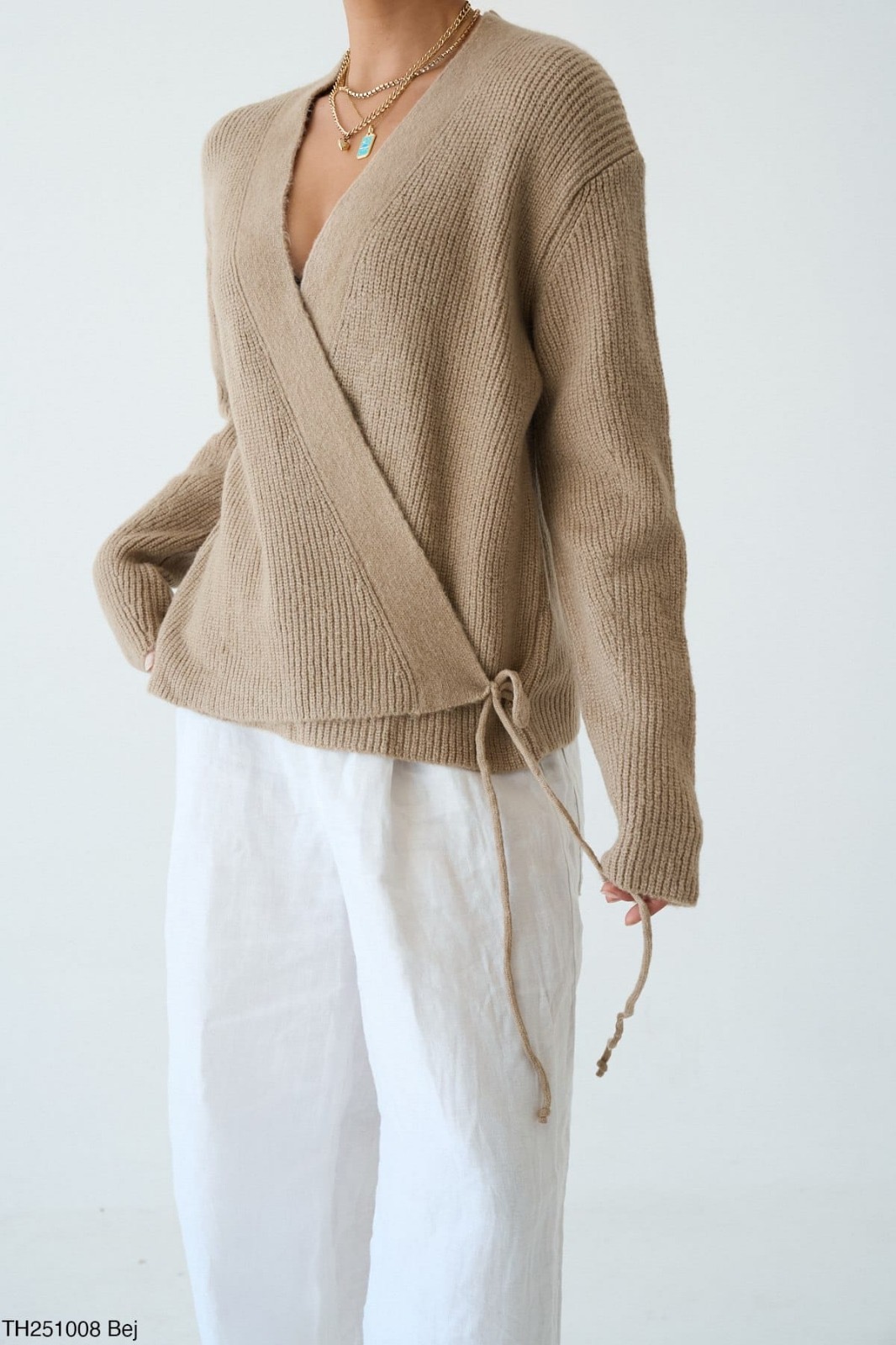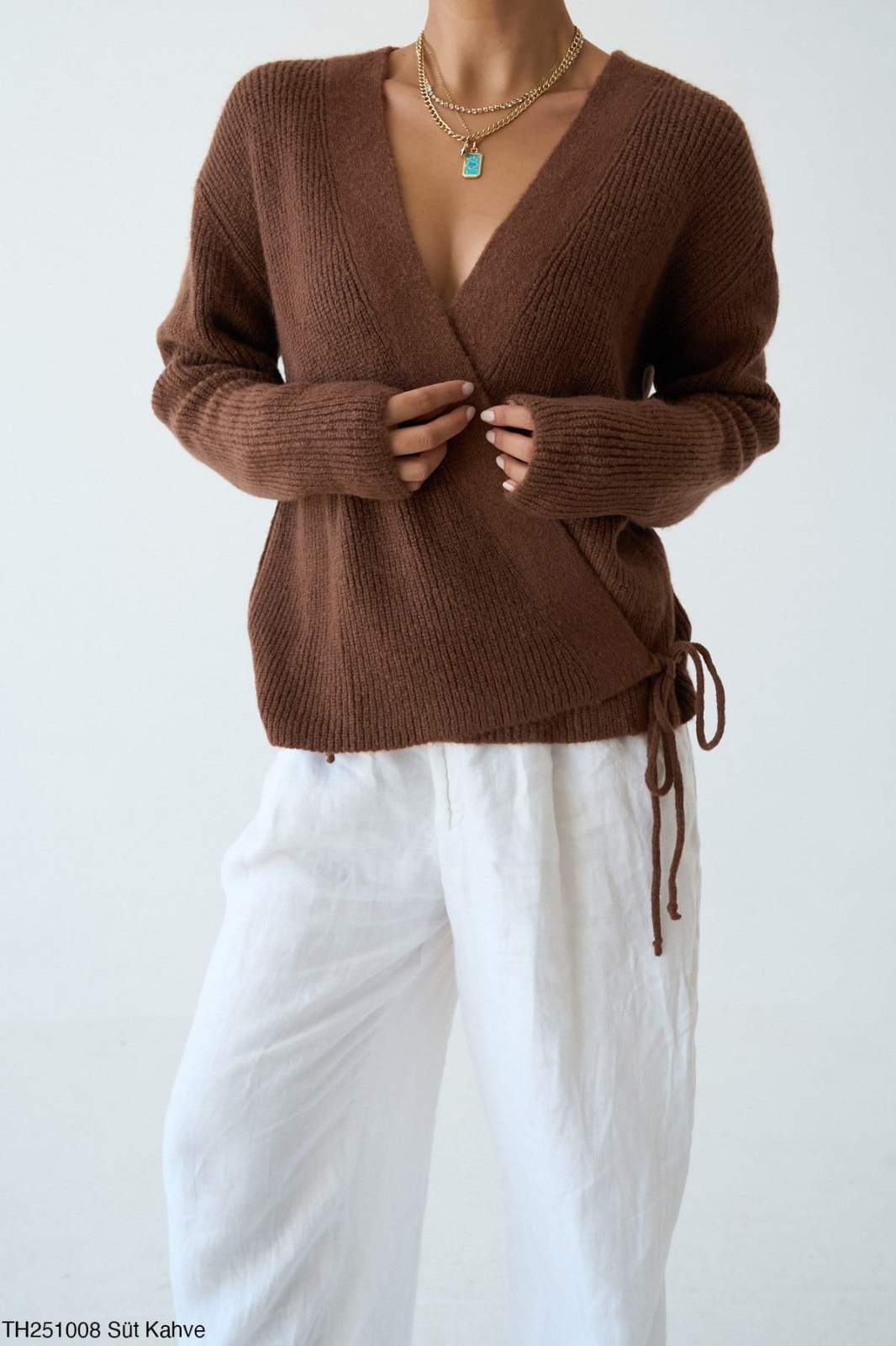 Yumuşak dokulu, bağlamalı triko kazak.