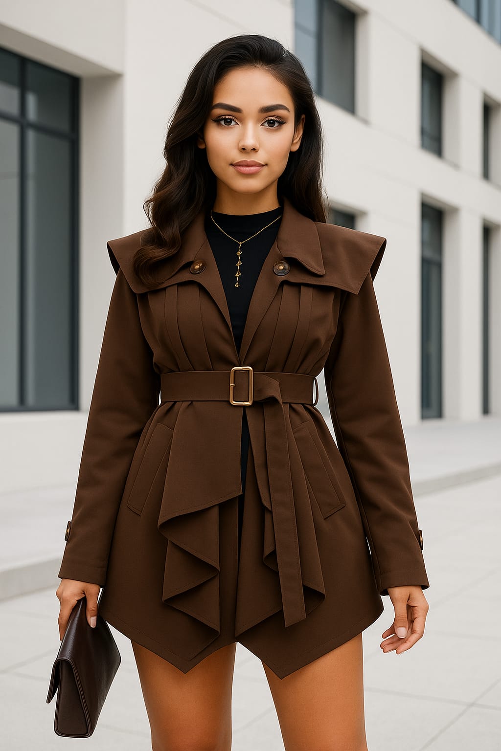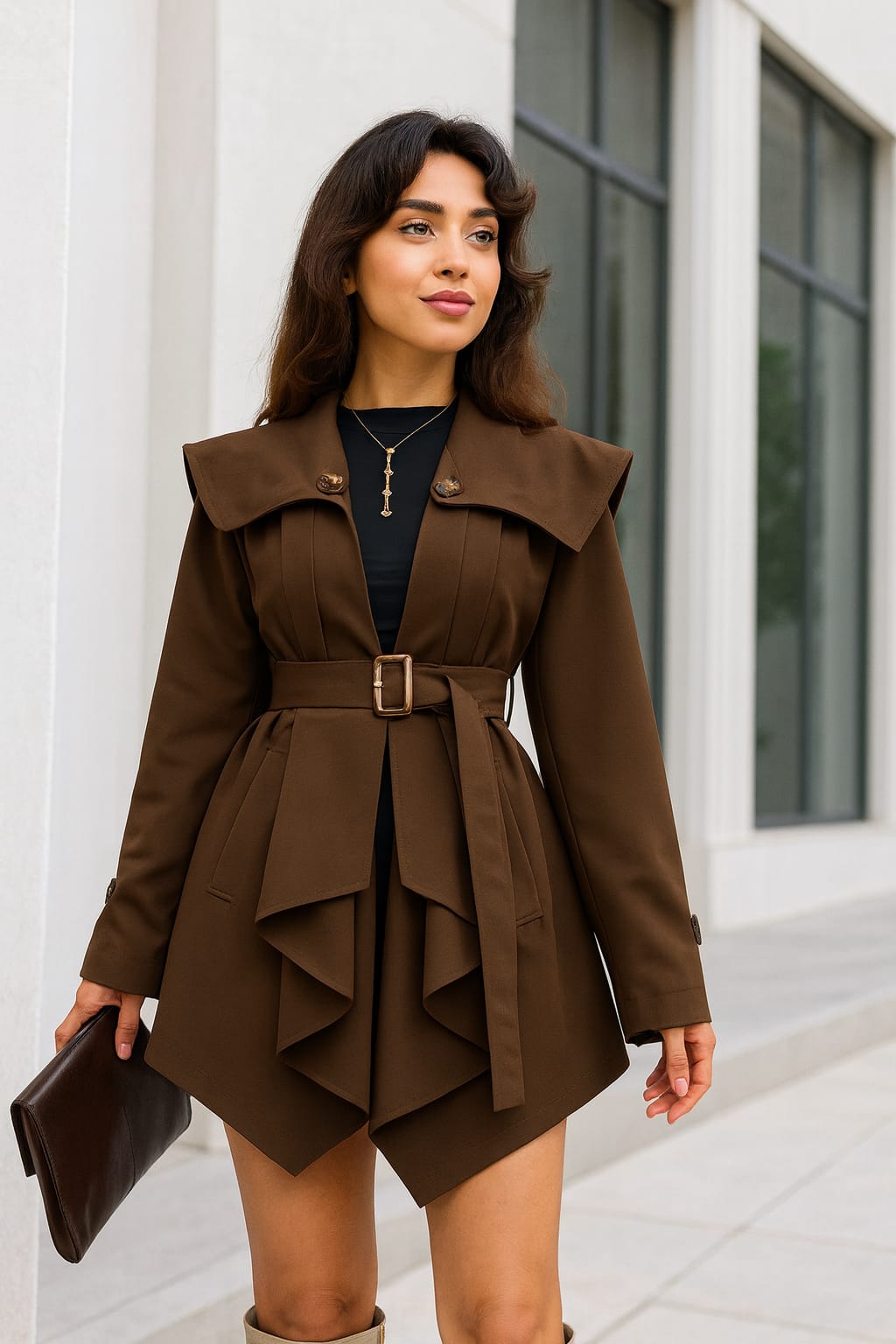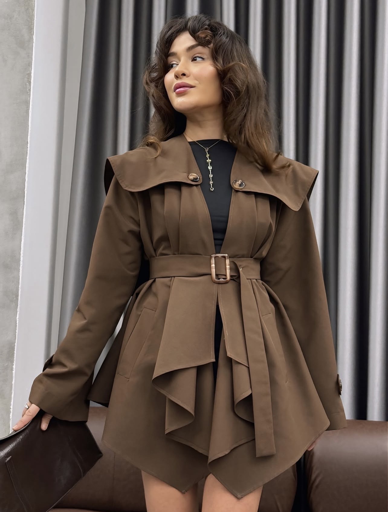 Pelinora’nın zarif ve modern tasarımlarıdan biri olan bu kamerli ceket ,şıklığı ve konforu bir araya getiriyor .Asimetrik etek detayı ve ayarlanabilir kemeriyle vücut hatlarını zarifçe vurgular .geniş yakası ve düğmeli tasarımıyla her mevsim kullanılabilir bir parça sunar.