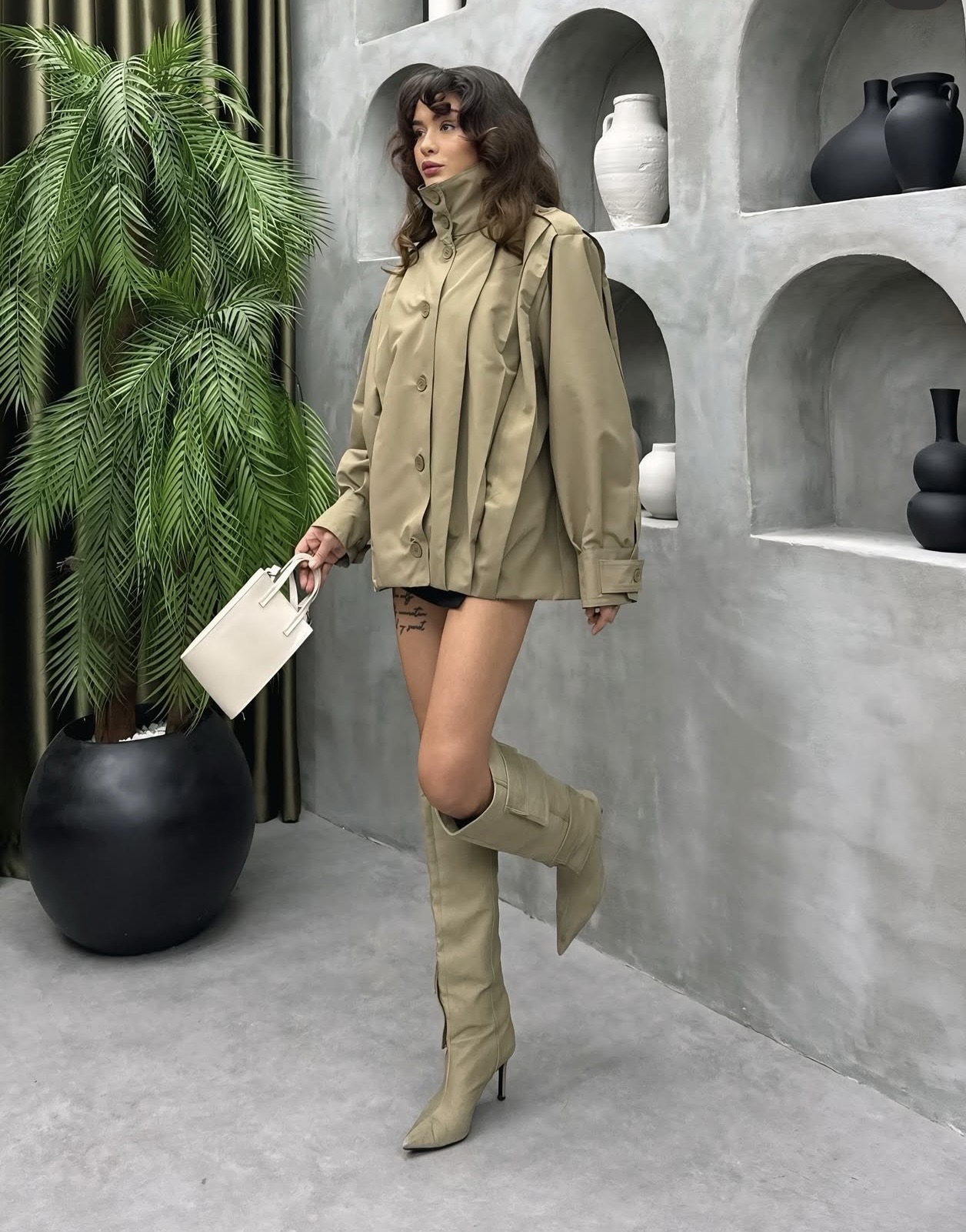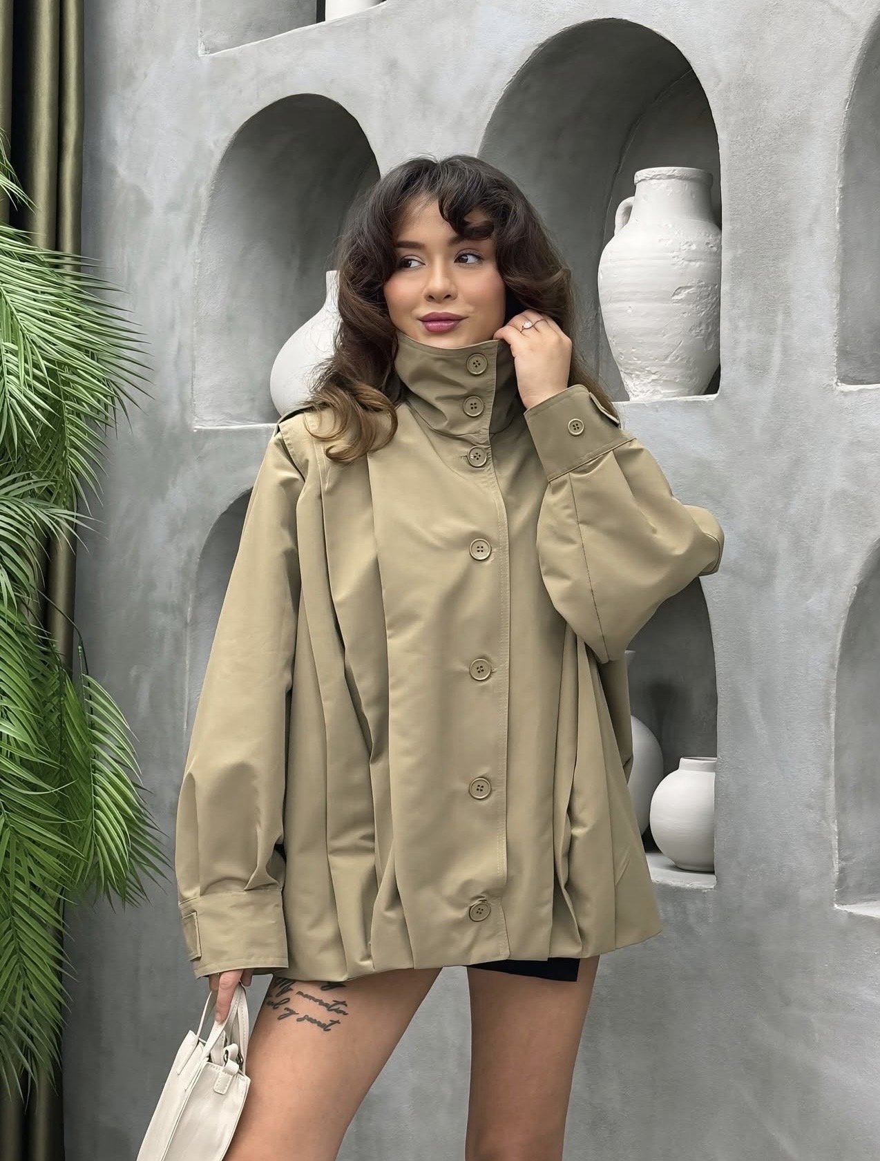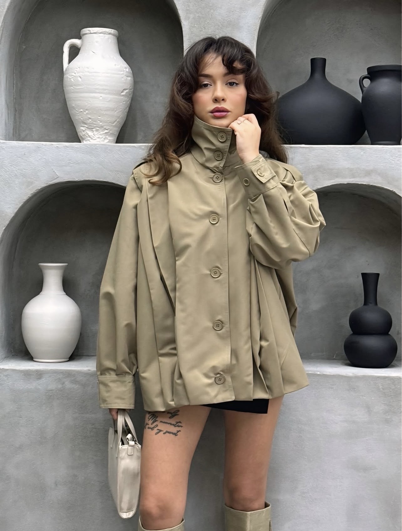 sade ve modern çizgisiyle zamansız bir şıklık sunar .yüksek yakası ,geniş kesimi ve düğmeli ön tasarımı ile konfor ve tarzıdır arada sunar.