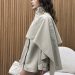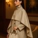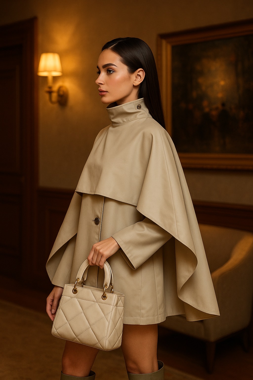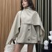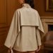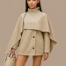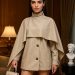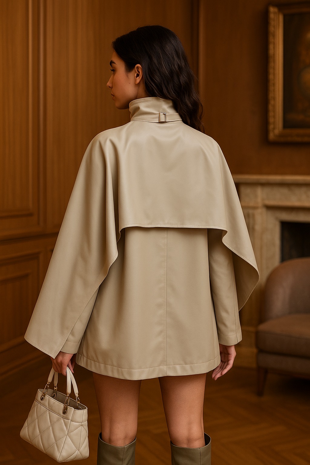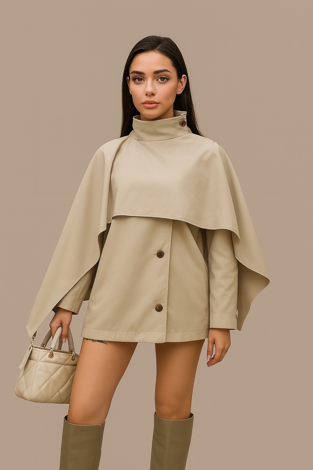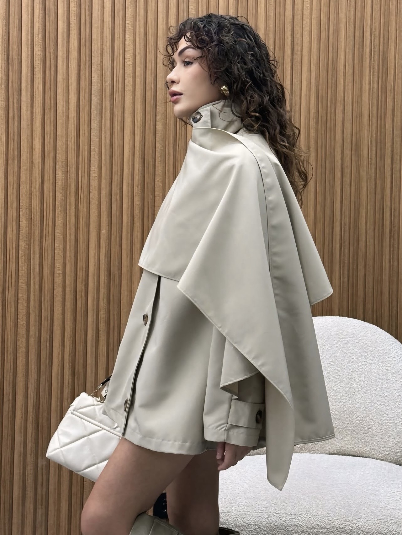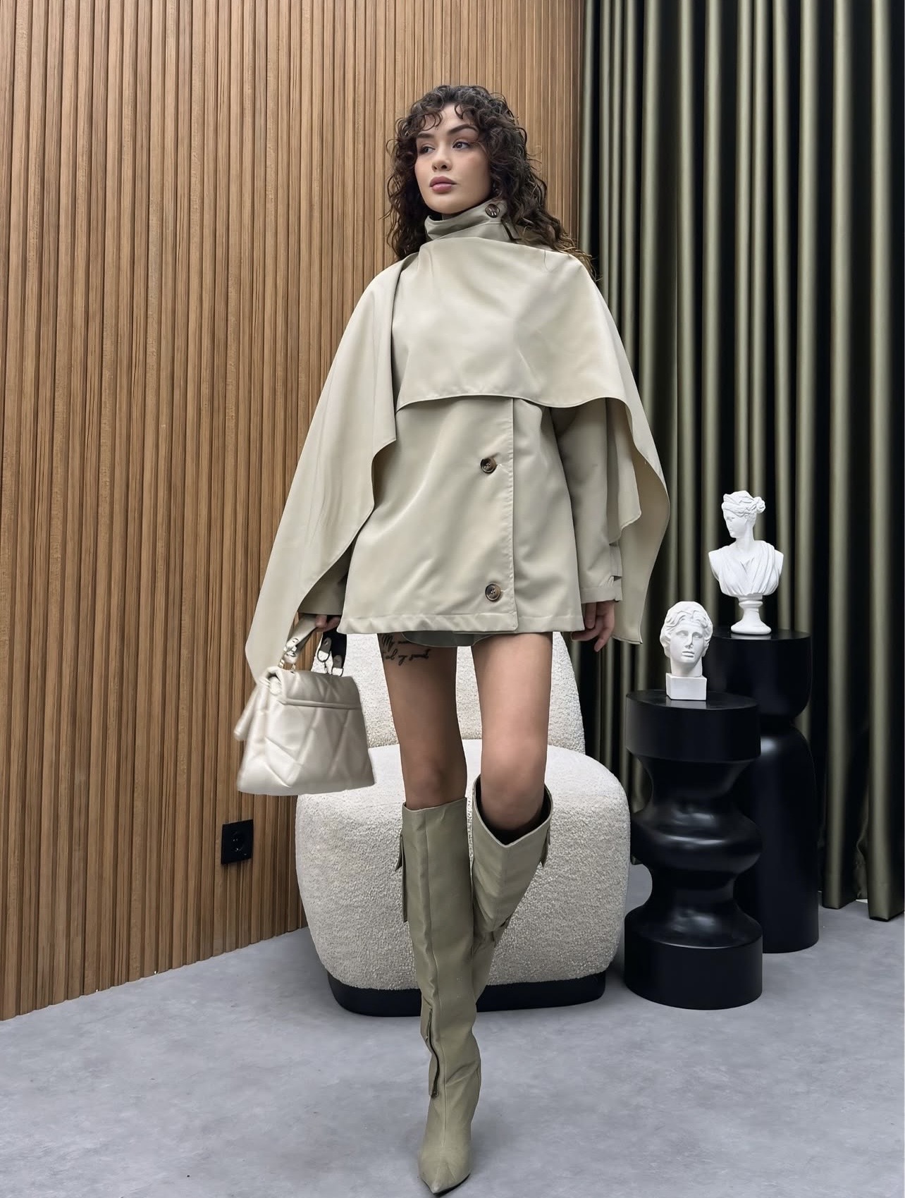 Modern ve zarif tasarımıyla dikkat çeken pelerin detaylı kısa ceket.